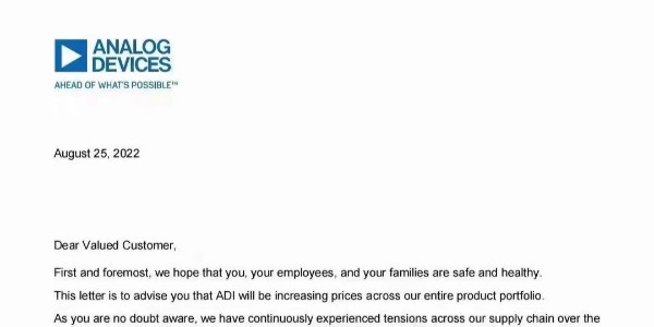 8月30日消息,ADI向其經銷商發布最新漲價函,據業內流傳出的漲價函顯示,ADI將提高全線產品價格,包括新訂單及現有預訂需求,但並未透露具體的漲幅,漲價將從自2022年9月25日起開始執行。